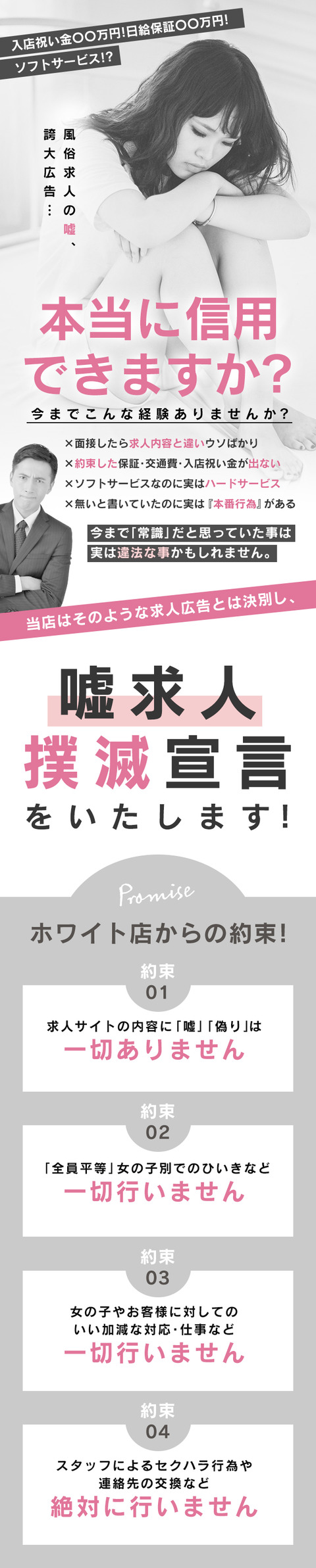 期間限定入店祝い金3万円プレゼントキャンペーン実施中!条件は出勤するだけ!ソフトサービスで性病の心配なし!雑費など引かれるものは一切無しで完全日払いで5万円以上可!優しいスタッフ&個室待機で居心地の良さ満点!シフト完全自由型で短時間、週1日からでもOKです!